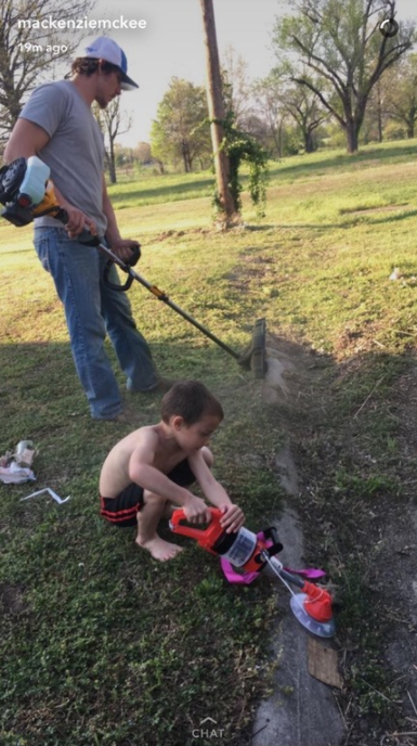 Recently, Mackenzie posted images and videos of her husband Josh weed-eating (edging, weed whacking, whatever you refer to it as) just inches away from Gannon’s face.